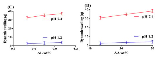 The concentration of polymers and monomer also influences the percent drug release from ASP/ALPAA hydrogels at both pH 1.2 and 7.4 as shown in Figure 2B–D. Maximum percent drug release is observed at both pHs as the concentration of ASP and AL increases (Figure 2B,C). Similarly, increase in percent drug release is indicated as the concentration of AA (Figure 2D) increases and vice versa. This all mean that, similar to swelling, pH dependent percent drug release is observed by fabricated hydrogels due to the presence of COOH groups of ASP, AL and AA. Higher the swelling, greater will be the drug loading and maximum will be the percent drug release [30,34] and vice versa.