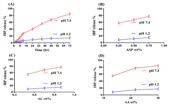Effect of (A) pH, (B) Aspartic acid (ASP), (C) Alginate (AL), and (D) Acrylic acid (AA) on IBP release percent from ASP/ALPAA hydrogels.
