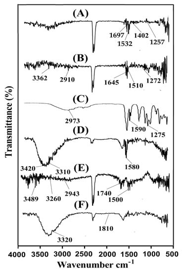 FTIR spectra of (A) Aspartic acid (ASP), (B) Alginate (AL), (C) Acrylic acid (AA), (D) unloaded ASP/ALPAA hydrogels, (E) Ibuprofen (IBP), and (F) drug-loaded ASP/ALPAA hydrogels.