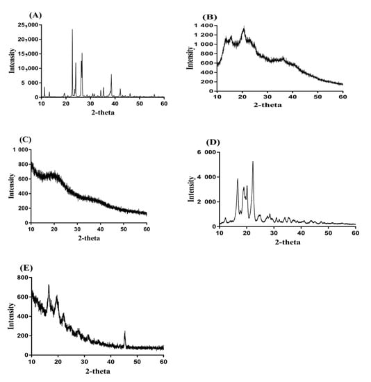 PXRD of (A) Aspartic acid (ASP), (B) Alginate (AL), (C) unloaded ASP/ALPAA hydrogels, (D) Ibuprofen (IBP), and (E) drug-loaded ASP/ALPAA hydrogels.