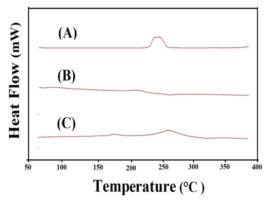 DSC of (A) Aspartic acid (ASP), (B) Alginate (AL), and (C) ASP/ALPAA hydrogels.