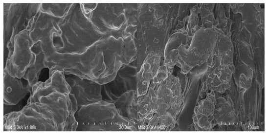 SEM is carried out to evaluate and examine the surface morphology of the ASP/ALPAA hydrogels. A smooth surface with few pores is seen at various magnifications as shown in Figure 7. The pores provide channels for the water molecules, and as a result swelling, drug loading and drug release from the developed hydrogels is perceived [51,52].