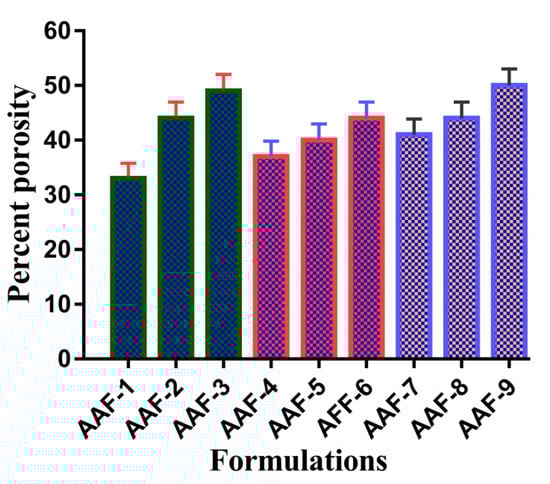 Porosity of a system depends on the number of pores present in its structure. Percent porosity for all formulations of ASP/ALPAA hydrogels is shown in Figure 8. It is demonstrated that as the concentration of ASP and AL increases, increase in porosity of the hydrogels is observed. Viscosity of polymers affects the porosity of the developed hydrogels. As the viscosity of the system is increased, the removal of bubbles from the polymeric hydrogels is decreased up to certain extent, which generate pores in the fabricated hydrogels and as a result porosity is increased [11]. Similarly, porosity of hydrogels is increased as the concentration of AA is increased and vice versa.