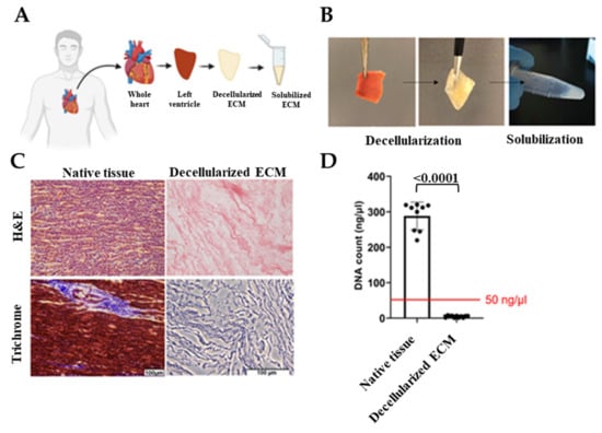 Decellularization of the native tissues and their biochemical analysis. (A) Schematic and (B) representative images demonstrating the workflow of the decellularization and solubilization process, (C) hematoxylin and eosin (H&E) and Masson’s Trichrome staining of native tissue and dhECM, and (D) quantitative measurements of total DNA content of native, decellularized cardiac tissue.