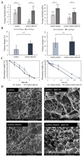 Mechanical and swelling characteristics of the hydrogels. (A) Young’s modulus values of GelMA and GelMA–dhECM hydrogels without and with microbial Transglutaminase (mTGase) treatment (left), of GelMA–MeHA and GelMA–MeHA–dhECM hydrogels without and with mTGase treatment (right), (B) Swelling properties of GelMA and GelMA–dhECM hydrogels with mTGase treatment (left), of GelMA–MeHA and GelMA–MeHA–dhECM hydrogels with mTGase treatment (right), (C) Controlled enzymatic degradation of GelMA and GelMA–dhECM hydrogels with mTGase treatment (left), of GelMA–MeHA and GelMA–MeHA–dhECM hydrogels with mTGase treatment (right), (D) Scanning electron microscopic images of lyophilized GelMA and GelMA–dhECM hydrogels with mTGase treatment (top), of GelMA–MeHA and GelMA–MeHA–dhECM hydrogels with mTGase treatment (bottom). (** p < 0.01, n.s.: not significant) (Student’s t-test) (n ≥ 3).