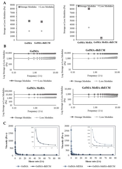 Viscoelastic properties of GelMA, GelMA–dhECM, GelMA–MeHA, GelMA–MeHA–dhECM hydrogels. (A) Storage and lost modulus values at a constant frequency of 1 Hz and a strain of 3%, (B) Change of storage and loss modulus with respect to frequency at a strain of 2%, (C) Plots of viscosity vs. shear rate, inset panels showing the change of viscosity with a smaller shear rate change (n ≥ 3).