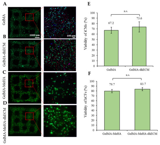 Cell viability analysis of the printed cell-laden hydrogels prepared using (A) GelMA, (B) GelMA–dhECM, (C) GelMA–MeHA, (D) GelMA–MeHA–dhECM, (E) live cell percentage comparison for GelMA and GelMA–dhECM, (F) live cell percentage comparison GelMA–MeHA and GelMA–MeHA–dhECM (n.s.: not significant) (Student’s t-test) (n ≥ 3).