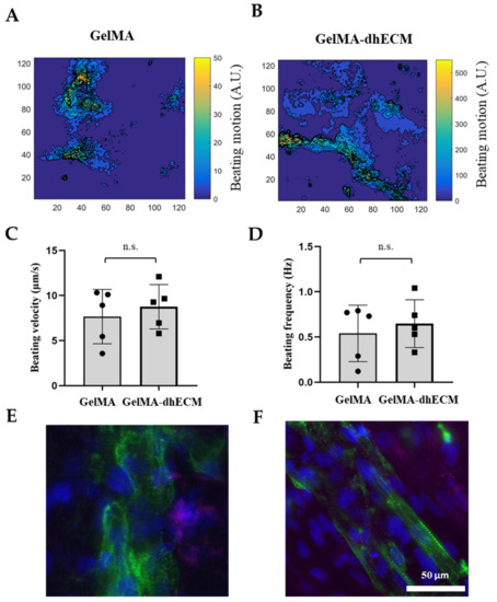 Spontaneous beating was observed as soon as 24 h after printing. To investigate the beating characteristics of iCMs, brightfield videos were taken nine days after printing (Video S2 (iCMs printed with G) and Video S4 (iCMs printed with GE)). Beating velocity and frequency of the printed tissue constructs were quantified by video analysis of lateral displacement of spontaneous beating iCMs and heat maps were generated using a custom-made MATLAB code (Figure 6A,B). Beating velocity was measured to be 7.7 µm/s ± 3 µm/s for G and 8.0 µm/s ± 2 µm/s for GE (Figure 6C) and beating frequency was calculated as 0.54 Hz ± 0.30 Hz for G and 0.65 Hz ± 0.26 Hz for GE (Figure 6D). As the results indicate, dhECM slightly improved beating kinetics and yielded faster iCM beating at higher frequencies. In previous studies, the beating velocities of the printed cardiac constructs were not reported. However, our results were in perfect alignment when iCMs were directly encapsulated in collagen hydrogel and the beating velocity was reported as 8 µm/s and frequency as 0.67 Hz [57].