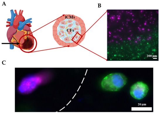 Printing the infarct region. (A) Schematic showing the infarct region model and corresponding cells. (B) Image showing the successful printing of the infarct region with iCMs (green) and hCFs (magenta). (C) Immunostaining of iCMs for sarcomeric alpha-actinin (green) and hCFs for Vimentin (magenta). Cell nuclei are stained with DAPI (blue).
