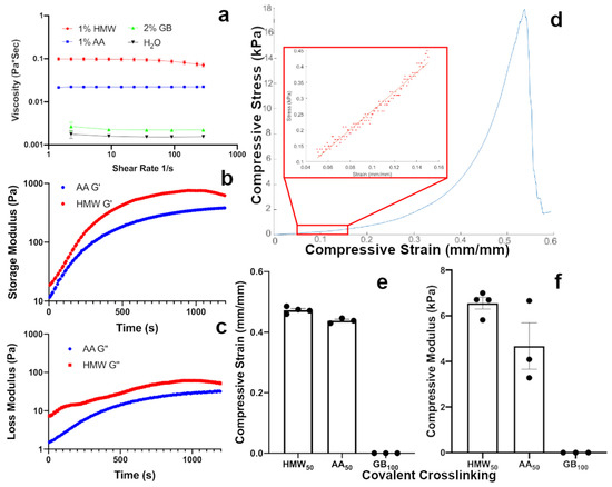 (a) The autoclaving and acid hydrolysis processes substantially reduced the dynamic viscosity of alginate solutions at shear rates ranging from 1 to 300 S−1. (b,c) AA and HMW alginate both form robust Ca2+ crosslinked hydrogels by internal gelation under time-sweep rheology conditions in under 20 min with plateauing storage (b) and loss (c) moduli. (d) Representative data of single uniaxial compression. (e) Compressive strain at failure of 1% (w/v) Eosin Y photocrosslinked AA50, HMW50, and GB100 molecular weights of methacrylated alginate. (f) Compressive modulus of 1% (w/v) Eosin Y photocrosslinked AA50, HMW50, and GB100 molecular weights of methacrylated alginate. Error bars represent standard error of the mean.