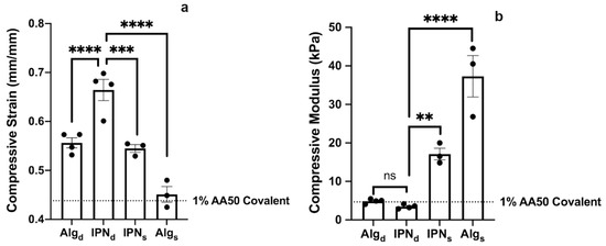 (a) IPNd exhibited the greatest compressive strain at failure and Algd and IPNs exhibited greater strain at failure than the pure alginate gels crosslinked with only Eosin. (b) The incorporation of the very low molecular weight GB100 alginate in Algs greatly increased the gel’s stiffness yielding the stiffest formulation tested, and the incorporation of GelMA without Ca2+ crosslinking in IPNs increased the stiffness well above that of the 1% alginate covalently crosslinked gels. ** p < 0.01, *** p < 0.001, **** p < 0.0001 by one-way ANOVA and Tukey’s post-hoc multiple comparisons test. Error bars represent standard error of the mean.