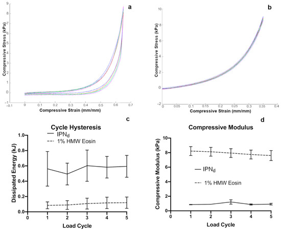Gels in such compression were allowed to rest for no more than 10 s between compression cycles in order to simulate near-continuous cyclic compression, judged to be the most challenging mechanism of cyclic compression likely to cause fatigue failure [47]. Using similar procedures, the highly compressible IPNd (sample data Figure 3a) was compared to more rigid 1% HMW50 Eosin crosslinked hydrogels (sample data Figure 3b). During compression, the compressive modulus was recorded similarly to single compression by approximating a zeroth order relationship between stress and strain between 5 and 15% compression during the compression cycle. The cycle hysteresis was calculated by using a nearest neighbor approximation for stress at a given point then computing the energy difference between the compression and decompression curves on each cycle. We found that for five consecutive cycles the compressive modulus and cycle hysteresis remained nearly constant with no significant deviation between the values recorded for a gel at different cycles (Figure 3c,d), however, the IPNd and HMW50 networks differed substantially from one another. This is consistent with previous results investigating Alginate/GelMA IPN’s crosslinked by methods slightly different than those employed here, although the strain at failure of gels observed in this study is higher than in previous work [32].