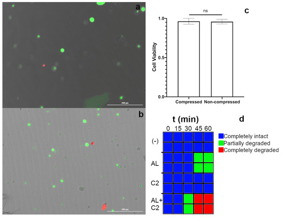 With the feasibility of gel degradation confirmed, we next investigated the biocompatibility of the entire process of cell encapsulation, compression and enzymatic removal from gels. Because of the particular relevance of highly compressible scaffolds for cell encapsulation to bone and cartilage tissue engineering [5,48], we investigated the viability of D1 mesenchymal stromal cells (MSCs) [49], following the degradation of gels at day 3 post encapsulation. We first encapsulated cells in two groups of IPNd hydrogels. Then 24 h after encapsulation, one group was subjected to a single cycle of 50% compressive strain under aseptic conditions and cultured for two more days to allow time for any compression triggered injuries to result in cell death. After this subsequent culture period, both compressed and non-compressed gels were enzymatically degraded to isolate cells, which were stained with Calcein-AM and ethidium homodimer 1 (live/dead stain; representative images Figure 4a,b). Both groups displayed viability well over 90%, and there was no significant difference observed between the viability of the cells in the compressed and uncompressed groups (Figure 4c). These results confirmed that cells could be recovered from IPNd hydrogels by enzymatic degradation for further study. They also suggest that the process of encapsulation compression to moderate strain and recovery through enzymatic degradation may not have an appreciable impact on cell viability, although more substantial investigation may be merited to confirm this property.