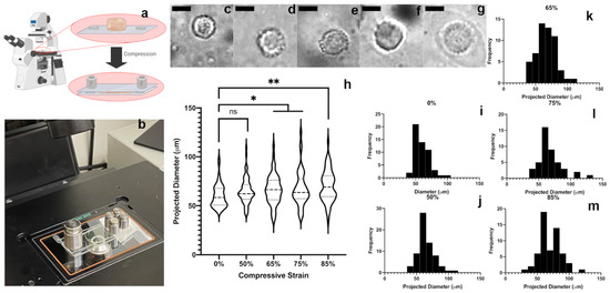 (a) A diagram of the process used for hydrogel imaging in compression. (b) A photograph of a hydrogel being compressed during imaging. (c–g) Representative images of in-focus cells at 0% (c), 50% (d), 65% (e), 75% (f) and 85% (g) compressive strain (gels failed at 85% compressive strain). Scale bars are 50 μm. (h) Violin plot of apparent cell diameter at 0, 50, 65, 75 and 85% compressive strain, with dashed line representing median and dotted lines representing first and third quartiles. Statistical comparisons refer to difference in sample mean from the 0% compression case, computed by one-way ANOVA with Holm–Sidak post-hoc analysis. (i–m) Histograms of projected cell diameter at 0, 50, 65, 75 and 85% compressive strain. Frequency is shown as absolute rather than relative frequency. * p < 0.0332, ** p < 0.0021. The number of cells imaged in each group varied between 45 and 65.