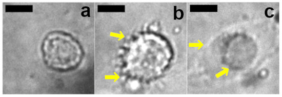 Representative images of three primary phenotypes observed during compression. (a) A typical healthy appearing cell. (b) A cell in the process of blebbing, note the surrounding detached bodies indicated by yellow arrows. (c) A cell displaying a phenotype which may correspond to compression injury, note the visible corona and inner cell body indicated by yellow arrows. Scale bars are 50 μm.