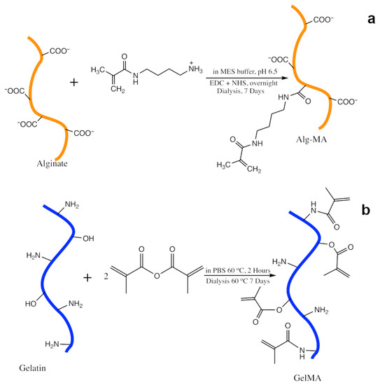 (a) Schematic of Alginate–MA preparation (b) Schematic of GelMA preparation.