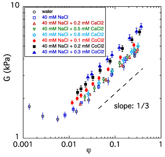 In general, alkaline earth metal ions cause gel contraction but do not form additional cross-links. Figure 2 also shows that when Ca2+ ions are replaced by Co2+ ions, the value of G increases with the increasing CoCl2 concentration (filled symbols). A probable explanation of the increase in the elastic modulus is complex formation between the Co2+ ions and the polyacrylate anion.
