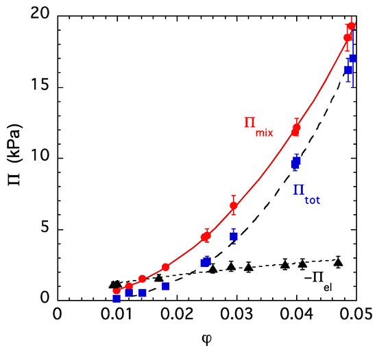 Figure 3 shows the total swelling pressure of a PA gel, Πtot, and its elastic Πel and mixing Πmix components at a constant ion concentration (csalt: 40 mM NaCl solution). Πtot was determined from osmotic stress measurements, Πel was estimated from the shear modulus (Πel = −G) and Πmix was calculated using the relationship Πmix = Πtot + G. Both Πtot and Πmix increase while Πel decreases with the increasing polymer volume fraction. The continuous curve is the least squares fit of Equation (4) to the Πmix data, which yields, for the interaction parameters, χ0 = 0.448 ± 0.001 and χ1 = 0.21 ± 0.01.
