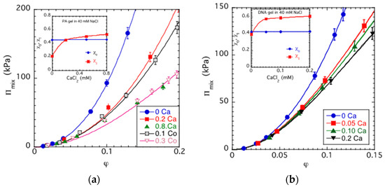 Mixing pressure, Πmix, vs. polymer volume fraction, φ plots for PA (a) and DNA gels (b) in different salt solutions. The continuous lines show the fits of Equation (4) to the experimental data. Insets: variation in χ and χ1 as a function of the CaCl2 concentration in PA and DNA gels swollen in 40 mM NaCl.