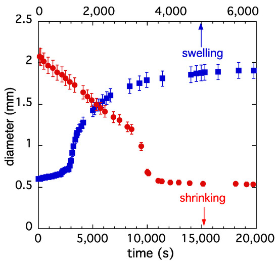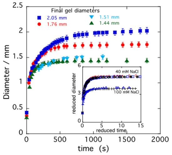 In Figure 5, the swelling kinetics data measured in 40 mM NaCl solution for spherical PA gels of different sizes are shown [53]. All samples exhibit a qualitatively similar behavior: the gel size monotonically increases as a function of time and asymptotically approaches a plateau. As expected, smaller gels swell faster. The inset in Figure 5 illustrates the variation in the reduced gel diameter dt/do with the reduced time t/τ1 for the same gels, as in the main figure (upper curves), and for gels swollen in 100 mM NaCl solutions (lower curves). At each salt concentration, the data points fall on a master curve. The height of the plateau region, corresponding to the equilibrium concentration of the fully swollen gels, decreases with the increasing salt concentration.