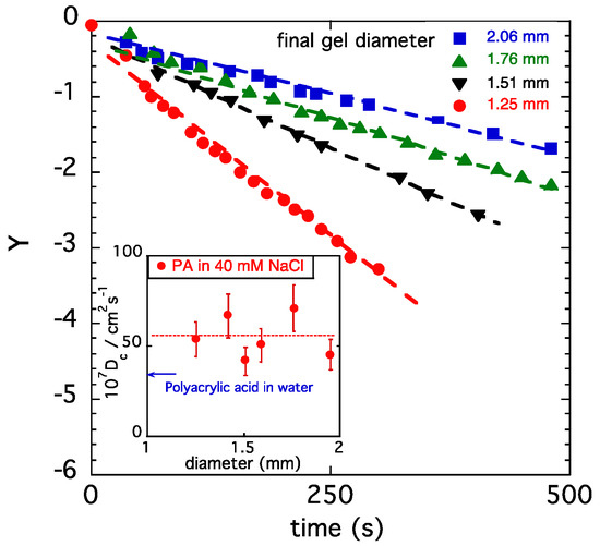 In the inset, the cooperative diffusion coefficient Dc is presented for PA gels of different sizes. In Figure 6, the value of Dc reported for a polyacrylic acid gel [51] measured in salt-free water by dynamic light scattering is also displayed. The present result shows that Dc in 40 mM NaCl solution exceeds the value measured in pure water by approximately 30%.