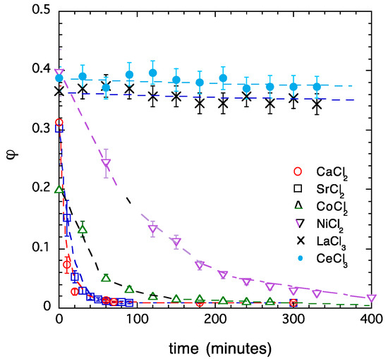 Measurement of the swelling rate makes it possible to estimate the relative ‘stability’ of the collapsed state of the gels. Figure 8 compares the rate of water uptake of PA gels containing various multivalent cations. To ensure a fair comparison between the swelling rates, prior to the swelling experiment, identical gel samples were collapsed in salt solutions containing 2 mM multivalent salt in 40 mM NaCl. Then, the collapsed gels were transferred into 40 mM NaCl solution. The reswelling of gels collapsed in solutions of alkaline earth metal salts (CaCl2, SrCl2) was the fastest, followed by gels deswollen in solutions of transition metal salts (CoCl2, NiCl2). For gels with trivalent cations (La3+, Ce3+), no appreciable reswelling was observed, even after 3–4 weeks. On the basis of the swelling curves shown in Figure 8, the stability of the collapsed state varies in the order La3+ ≈ Ce3+ > Ni2+ > Co2+ > Ca2+ ≈ Sr2+. These results are in qualitative agreement with the results of the osmotic and mechanical observations discussed above.