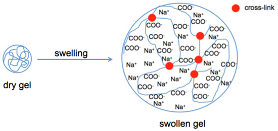 Polyelectrolyte gels are polymer networks in which the charged sites are fixed on the polymer chains, and the counter-ions in the surrounding liquid ensure electroneutrality. Due to the repulsive interaction between identically charged groups on the macromolecules, the dry network swells by absorbing solvent (e.g., water) molecules. The amount of water absorbed by a typical polyelectrolyte network can exceed 1000 times the weight of the dry polymer. However, the polymer network cannot be dissolved because of the presence of permanent cross-links. Changing the environment of the gel (salt concentration, pH, etc.) affects its swelling degree. As discussed earlier, with an increasing salt concentration, the counter-ions gradually screen the electrostatic repulsion between the charged groups on the polymer chains, and above a critical threshold, the salt concentration leads to the collapse of the gel. This effect can be reversed by removing the salt from the collapsed gel. The swelling process is illustrated in Scheme 2.