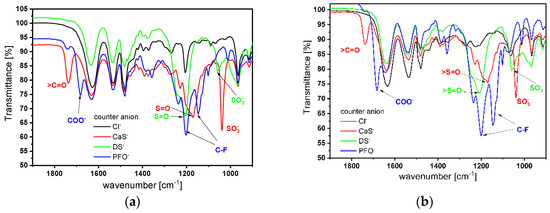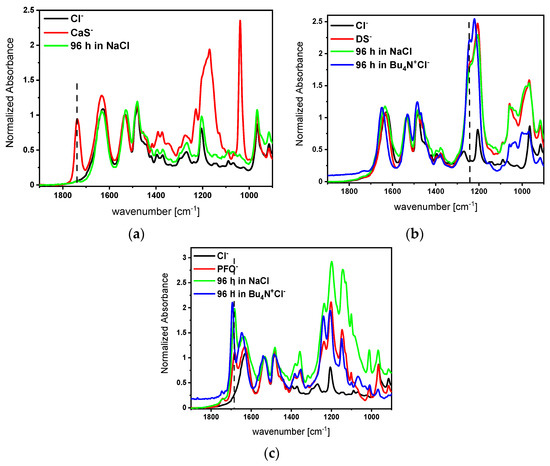 The anion exchange was followed by FTIR spectroscopy. New absorption bands appeared for specific functional groups of hydrophobic anions after the Cl− exchange (Figure 1a,b). A C=O stretching vibration at 1738 cm−1, S=O stretching at 1170 cm−1, and sulfate bending at 1039 cm−1 represented the presence of the CaS anion. The absorption bands at 1215 cm−1, with a shoulder at 1240 cm−1 and 1058 cm−1, are typical for the S=O stretching and SO3− of DS. The strong carbon-fluor bending vibrations at 1202 and 1147 cm−1, with the C=O stretching vibration of the carboxylate anion at 1683 cm−1, are attributed to the PFO anion.