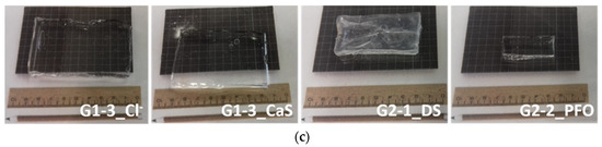 Previously, we (among others) showed that simple quaternary ammonium-based materials can simply reversibly change from a superhydrophilic to a superhydrophobic surface by counter ion exchange [17,22,25,26]. The simple exchangeability of ions led us to create hydrogels with hydrophobic properties. Due to this fact we scrutinized the commercially available hydrophobic counter anions. Three different counterions for anion exchange in cationic methacrylamide-based hydrogels were selected: dodecyl sulfate (DS) with linear alkyl chain, perfluorooctanoate (PFO), as a highly hydrophobic fluorinated example, and camphor sulfate (CaS), as a bulky and branched alkyl moiety, all with a similar number of carbons. Equilibrated and washed gels were immersed in a solution of various hydrophilic anions to allow for a spontaneous counter anion Cl− exchange. Moreover, the possible rest of the unexchanged polymer pendant groups (3-trimethylammonium-propyl chloride) in the G1 series and 2-hydroxyethyl in the G2 series can serve as a hydrophilic phase to ensure a certain water retention in the gel. This is important for various applications, where both hydrophobic and hydrophilic moieties are required, such as for bio-applications involving hydrophobic drug delivery or for applications where so-called polysoap, which is similar to surfactant in certain properties [46], is needed. For screening how the anion exchange will affect the hydrogel samples, all gel formulations were immersed in a DS anion solution. Some pictures of the as-prepared gels, after washing and after anion exchange, are listed in Figure S2 (in Supplementary Materials). A dimension decrease was observed in all samples. The shape change, accompanied by an extensive loss of transparency, was observed in the G1-1-DS sample. On the other hand, the sample, G2-1-DS, with the same crosslinking density, has at least been affected by the anion exchange. Mechanically tough samples with a higher crosslinking density exhibit a loss of shape stability, with cracks and peeled parts in both series. From the abovementioned mechanical instability of some of the gel formulations, samples G1-2 and G1-3 from the G1 series and samples G2-1 and G2-2 from the G2 series were selected for the next experiments involving anion exchange. Anion exchange causes hydrogel dimension shrinkage, where hydrophobic anions expel water in the case of DS and PFO anions (Figure 1c). We assume that during the exchange, a hydrogel is formed, with a strong ion pairing between the quaternary ammonium and DS and CaS and PFO negative ions. This pairing led to a strong coordination and decrease in hydration energy, also leading to changes in the swelling of the gels. The changes in water swelling are summarized in Table 2. The amount of released water, WR, was calculated based on the theoretical anion uptake, where 50% and 100% of the Cl− anions were exchanged in the G1 and G2 series, respectively (the same amount in both series). The range of water loss was 80–95% in comparison with the water content, before the anion exchange. Slightly higher water losses for the less dense G1-2 for both DS and PFO were observed. In the G2 series, no difference between anions or crosslink density was visible. Interestingly, in the case of CaS anion, the gels increased their weight and swelled by 10%. This is probably due to the bulky structure of the camphor-based moiety, with a reduced ability to become entangled with the hydrophobic part of the main polymer chain. On the other hand, there is a difference in behavior in comparison with the linear long alkyl chains of DS and PFO. Thus, no water is displaced from the hydrogel by CaS, while the entanglement of the linear alkyl moieties of the counterions with the polymer backbone in the case of DS and PFO led to a water release after the anion exchange.