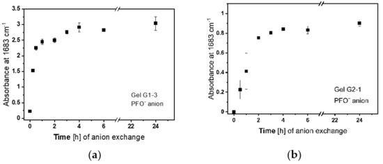 Kinetics of the PFO anion exchange in (a) the G1 and (b) G2 hydrogel series, monitored by FTIR at the 1683 cm−1 absorption band, which is typical for the PFO anion. c(PFO) = 0.05 and 0.034 mol L−1 for G1-3 and G2-1, respectively.
