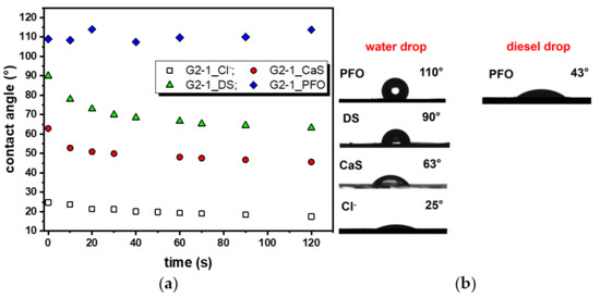 (a) Contact angles and time evolution of the contact angle on the surface of the G2-1 hydrogel type, before Cl (white square) and after the exchange with CaS (red bullet), DS (green triangle), and PFO (blue diamond) anions; (b) Photographs of 3 μL of water (left) or diesel (right) droplets, present on the surface at the beginning of the measurements.