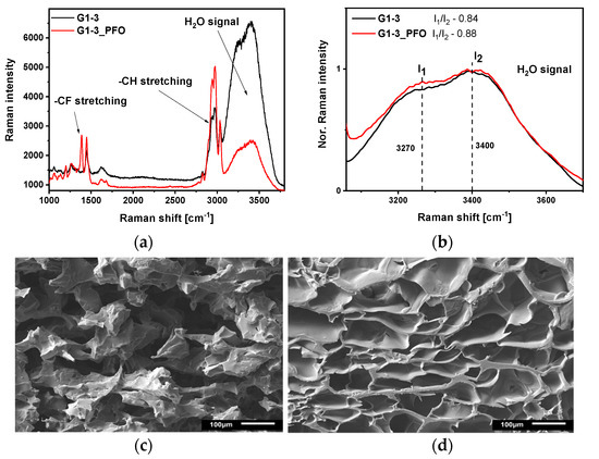 Due to the uniqueness of the hydrogels, with a very hydrophobic character after the PFO exchange, we focus, furthermore, on the investigation of the water confinement, morphology, and polarity in the hydrogels after the exchange with the PFO anions (Figure 5). The water characteristics in the hydrogels were quantified using the Raman absorption band of water. A focused confocal layer at 100 µm from the top of the hydrogel, with a thickness of approx. 1 mm, exhibited water bimodal OH stretching, with characteristic Raman bands at approx. 3270 cm−1 (I1) and 3400 cm−1 (I2) for the G1-3-Cl hydrogel and G1-3-PFO, respectively, after the anion exchange (Figure 5b). The full Raman spectra of both gels are shown in Figure S4 (in Supplementary Materials). The main difference between the two spectra is the intensity of the water signals, which are in the range of 3100–3600 cm−1, in relation to the CH stretching bands of the alkyl pendant groups of the methacrylate polymer chains, which are at approx. 2970 cm−1 (Figure 5a). Considering the unchanged alkyl stretching before and after the anion exchange, the G1-3-Cl hydrogel exhibited a significantly higher intensity of the water band in comparison with the alkyl signal due to the higher water content. Conversely, this alkyl signal is stronger in the G1-3-PFO hydrophobic gel, where the water molecules were expelled from the gel after the anion exchange. The typical water signal in the range of 3100–3600 cm−1 was divided into two bands (Figure 5b). These bands are assigned to strongly (I1) and weakly (I2) hydrogen-bonded water molecules [50]. The observed I1/I2 ratio is higher for G1-3-PFO (0.88) than for hydrogel G1-3 (0.84). This is in accordance with our hypothesis, namely, that the free water molecules are in confinement, with a weak hydrogen bonding present in the G1-3 hydrogel that is partially expelled after the anion exchange in G1-3-PFO. Thus, the ratio of strongly hydrogen-bonded water molecules, which interact with the main polymer backbone remaining in the gel, is higher in the G1-3-PFO hydrogel [51]. As discussed, it is assumed that the hydrophobic counterions are in a collapsed state. Additionally, an SEM analysis was performed to study the porous structure of xerogels from the G1-3-CL and G1-3-PFO samples (Figure 5c,d). G1-3-Cl showed large symmetric pores in the range of 50 to 80 µm (Figure 5c), while the G1-3-PFO sample led to asymmetric pores and a dramatic reduction in the pore size to 15–50 µm due to less swelling (Figure 5d). Moreover, a thicker wall size of solid content was observed, with a heterogeneous pore size distribution from the interphase to the center of the hydrogel. A thicker wall, indicating a collapsed state, formed after the PFO addition, and smaller pores were observed in close proximity to the edge of the hydrogel, indicating a different distribution of the PFO ion, based on the diffusion of ions.