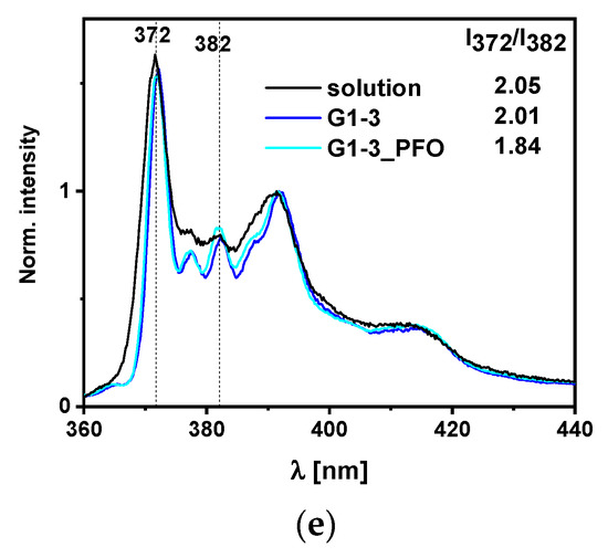 In addition, the polarity in the bulk of the gels was studied, using pyrene as a fluorescence probe. The pyrene probe diffused into the bulk interior of the gels, sensing its polarity through the polarity dependent intensity of the first vibronic band at 372 nm of the pyrene monomer emission. The ratio of the first and third (at 382 nm) I372/I382 emission is the so-called “pyrene scale” [52,53]. A more polar hydrophobic nature of the G1-3-PFO gel was expressed, with a lower I372/I382 ratio of 1.84, in comparison with the original G1-3-Cl gel or water/MeOH solution, where I372/I382 reached similar values of ~2 (Figure 5e).