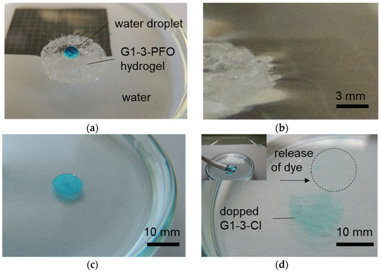 (a) Image of a water droplet (doped by methylene blue dye) on top of the G1-3-PFO hydrogel and floating in a water pool in a Petri dish; (b) image indicating the convex meniscus on top of the water, after the immersion of the G1-3-PFO hydrogel in the pool; (c) image of the G1-3-PFO hydrogel (doped with methylene blue dye) floating in the water pool in the Petri dish; and (d) image of the G1-3-Cl hydrogel (doped with methylene blue dye) sunk under water, with the inlet showing the dopped G1-3-Cl hydrogel before immersion.