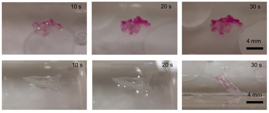 Furthermore, due to the preference for the Cassie Baxter state at the beginning of floating, the hydrogel in the interphase doped with pH indicators (phenolphthalein) was used. The hydrogel pH floating device in contact with a basic solution containing volatile NH3 led to a gradual and progressive change immediately after the hydrogel immersion due to the evaporation of NH3 and subsequent penetration of the NH3 vapor into the floating pH device (Figure 7 upper). On the other hand, in the case of a nonvolatile base, such as NaOH, this did not result in an immediate change of pH in the floating hydrogel device, beginning at the edges of the hydrogel sample after 30 s of floating (Figure 7 bottom). Despite the broad availability of pH probes and sensing setups, devices, and materials, reports on floating devices to distinguish between volatile and nonvolatile bases in a controlled manner are rare.