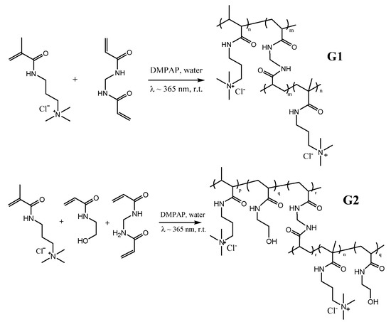 Polycationic gels were prepared by the free radical crosslinking polymerization of a 3-(methacryloylamino)propyl]trimethylammonium chloride (MTAC) monomer (gel series G1) or a mixture of cationic MTAC and a neutral N-(2-hydroxyethyl) acrylamide (HEAA) monomer (gel series G2) crosslinked by N,N’-methylenebis(acrylamnide) (MBA) and photoinitiated by 2,2′-dimethoxy-2-phenylacetophenone (DMPA), as is schematically described in Scheme 1. The composition of monomers and the amount of crosslinker in the final hydrogels are listed in Table 1. We fabricated the first hydrogel from either a quaternary ammonium (meth)acrylamide-based monomer MTAC, with a concentration of the monomer of 2 M in the feed and various concentrations of the MBA crosslinker, starting from 1–5%, as depicted in Table 1, entry 1–4. The second type of hydrogel, shown in Table 1, entry 5–8, was fabricated in an equimolar ratio of MTAC and HEAA, with an overall concentration of the monomer of 2 M and different MBA crosslinker concentrations in the feed. The monomer, HEAA, was chosen, since it is highly water-soluble, it is not expected to change, and it has the same functionality in the polymeric methacrylamide backbone. Moreover, polymer materials based on HEAA are highly biocompatible and prevent biofouling [40,41], which make them attractive for biomedical and bioengineering applications. As the prepared gels were immersed, the physiological solution was equilibrated in a repeated manner to remove unreacted monomers and low-molecular-weight species. A different extent of swelling was observed as a function of the crosslinking density (Table 1). In the equilibrium state, the gels swelled suddenly. In this context, a higher swelling has been observed for MTAC-based polycationic gels, G1. In both cases, the swelling degree was consistently lower for the denser network with an increasing crosslinker content. Due to the polyionic nature of the gels, the gels exhibit a standard polyelectrolyte effect, which was responsible for its higher swelling in pure water.