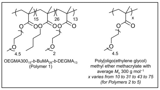 - Constantinou, A.P.; Patias, G.; Somuncuoğlu, B.; Brock, T.; Lester, D.W.; Haddleton, D.M.; Georgiou, T.K. Homo-and co-polymerisation of di (propylene glycol) methyl ether methacrylate–a new monomer. Polym. Chem. 2021, 12, 3522–3532. [Google Scholar] [CrossRef]