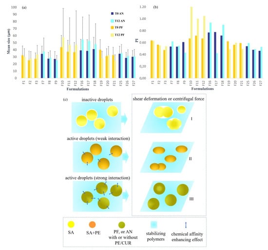 Phase separation was observed after T12 followed by centrifugation for formulations F4, F5, F22, F23, and F24 (SA in the presence of PE). The addition of PE provided suitable surface tension, which improved the stability of the systems until day 12. Hence, droplets composed of the PE+SA indicated that better chemical interactions were established with the polymeric matrix (Figure 2c, II and Figure S1). However, the high trend of coalescence for SA preparations discouraged further studies. On the other hand, the combination of PE and PF or AN oil phase led to highly stable droplet size (low PI values) under thermal and temporal dynamics, reinforcing a potential stabilizing effect of PE (with or without CUR) components, as proposed in Figure 2c, II. The centrifugal inertial shape and the consequent shear stress quote droplets deformations, with small collision and coalescence for systems containing AN and PF (active droplets, with interface/oil component chemical interaction, Figure 2c, II and III). Thus, emulgels composed of AN oil presented reduced variation in globule size, with F9 and F17 displaying the smallest size of globules. Although most AN systems showed an increment of the droplet size, their variation range was smaller than that observed for PF systems. AN oil presents low chemical unsaturations in its structure and, consequently, high viscosity is be observed in Figure 3, hindering the oil transition through the polymeric mesh, also preventing coalescence. Therefore, AN oil showed to be the most stable vegetable oil in the emulgels studied.
