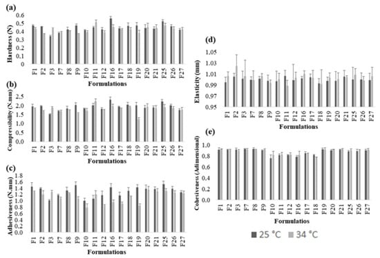 The effect of temperature, polymer type, vegetable oil type, and bioactive agent composition on TPA properties of the emulgels at 25 °C and 34 °C: (a) hardness; (b) compressibility; (c) adhesiveness; (d) elasticity; (e) cohesiveness. Each bar graph represents the average, and the relative standard deviation was less than 10% (n = 3).