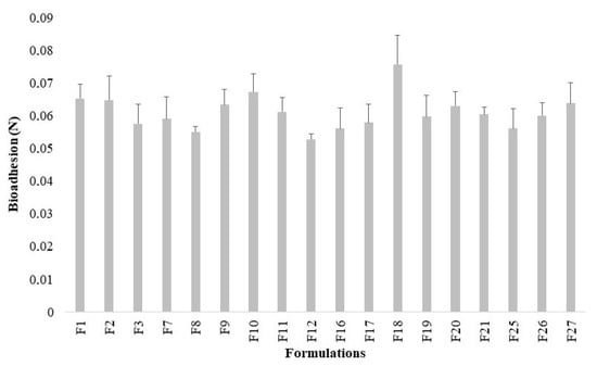 All formulations displayed similar force values necessary to detach the pig skin from the sample surface (Figure 6). The effects of polymer type, vegetable oils, and different bioactive agents were not statistically significant in bioadhesion (p > 0.05).