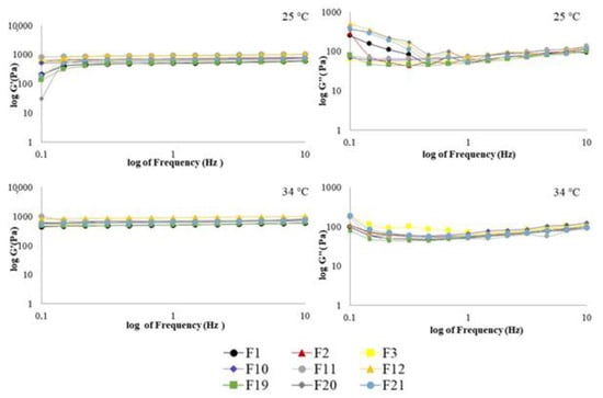 After fitting linear viscoelastic region (LVR), the frequency sweep was performed from 0.1 Hz to 10.0 Hz [,,,]. The elastic modulus (G’), viscous modulus (G”), dynamic viscosity (η’), and loss tangent (tan δ) were measured by using the RheoWin 4.10.0000 (Haake®) software. At least three replicates for each sample were analyzed.
