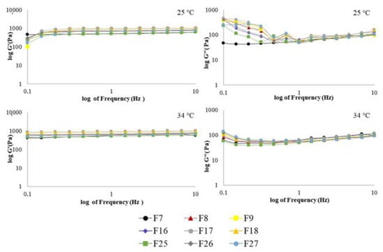 Elastic modulus (G’) and viscous modulus (G’’) as a function of frequency of formulations containing PF oil. Each point is the mean of at least three replicates. Standard deviations have been omitted for clarity; however, in all cases, the relative standard deviation of replicate analysis was less than 10%.