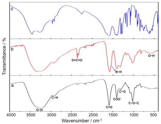 Infrared spectra of (a) sodium alginate, (b) CA–SC, and (c) sodium citrate.