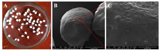 (A) Digital and (B,C) SEM photos of CA–SC; (C) is a partial enlargement of (B).