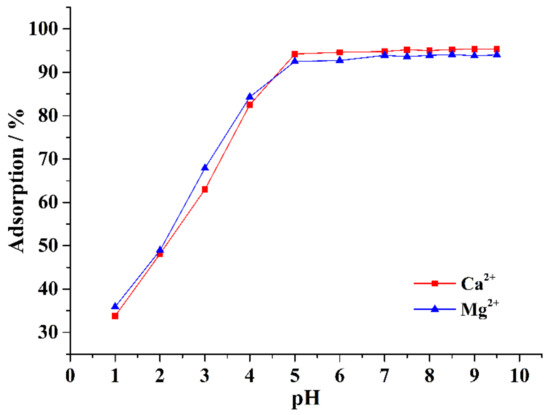 Approximately 0.1 g of CA–SC was weighed, added into 50 mL of 1.5 mM Ca2+ (or Mg2+) solution of different pH (1, 2, 3, 4, 5, 6, 7, 7.5, 8, 8.5, 9, or 9.5), stirred for 6 h, and then filtered. The amount of remaining Ca2+ (or Mg2+) in the filtrate was determined by ICP-OES. It can be seen from Figure 4 that as the pH of the solution increases, the adsorption capacity of CA–SC for Ca2+ and Mg2+ gradually increases and becomes stable. When the solution pH value is less than 1.0, the removal efficiency of CA–SC for Ca2+ and Mg2+ is less than 35%. This result may be attributed to the protonation of the –COO− and –NH groups on CA–SC under a strong acid environment, thereby reducing the amount of coordinated functional groups with Ca2+ and Mg2+. In addition, according to the solubility product rule, when the pH of a solution is higher than 9.78, Mg2+ in the solution begins to form Mg(OH)2 precipitation (when pH is higher than 12.78, Ca2+ begins to form Ca(OH)2 precipitation). Therefore, the optimal pH range of the solution is 5.0–9.5. Within this range, precipitation is absent, and only few protonated functional groups are present.