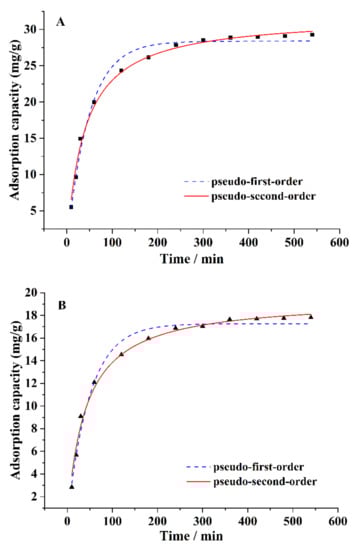 The pseudo-first-order kinetic equation is qt = qe (1 − exp(−k1t)), the pseudo-second-order kinetic equation is qt = qe (1 − 1/(1 + qek2t)) [25,26], where k1 and k2 are the rate constant of pseudo-first-order and pseudo-second-order, respectively, qt is the amount of metal adsorbed at a certain time (t), and qe is the amount of metal adsorbed at equilibrium.