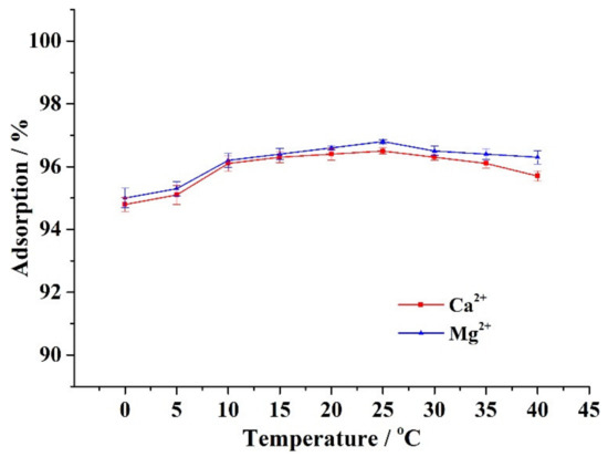 Approximately 0.1 g of CA–SC was weighed, added into 50 mL of 1.5 mM Ca2+ (or Mg2+), stirred at 0 °C, 5 °C, 10 °C, 15 °C, 20 °C, 25 °C, 30 °C, 35°C, or 40 °C for 6 h, and filtered. Figure 6 shows that the ambient temperature has a minimal effect on the adsorption capacity of CA–SC. In the ambient temperature range of 0–40 °C, the removal efficiency of CA–SC for Ca2+ and Mg2+ remains at 94–97%, which indicates that CA–SC is suitable for treating water containing Ca2+ and Mg2+ at different temperatures.