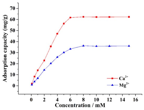 Although Ca2+ and Mg2+ in water have no direct health hazards, they have unwanted effects, such as scaling on water appliances and reduced washing efficiency of soap and detergent [1]. Prolonged consumption of drinking water containing Ca2+ and Mg2+ increases the incidence of stone in the human filtration system. In industry, the precipitation of calcium and magnesium salts forms scale, hinders heat conduction, and even causes a boiler explosion in severe cases. Therefore, developing a new method of removing excessive Ca2+ and Mg2+ from water has important application prospects [2]. At present, the methods for Ca2+ and Mg2+ removal from water mainly include precipitation [3], boiling [4], use of lime–soda ash [5], ion exchange [6], electrodialysis [7], and adsorption [8,9]. Among such treatment methods, the adsorption method has attracted much attention in recent years because of its advantages of simple operation, recyclability, and low cost [10,11].