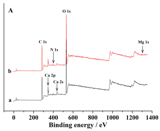 To clarify the mechanism of CA–SC binding with Ca2+ and Mg2+ ions, we performed XPS analysis on CA–SC samples before and after being loaded with Mg2+. As can be seen in Figure 8A, the peaks around 399.6, 437.8, and 532.4 eV can be assigned to N 1s, Ca 2s, and O 1s element peaks, respectively. The new Mg 2s peak at 1303.3 eV in (b) indicates that the CA–SC was successfully loaded with Mg2+ after immersion in a Mg2+-containing solution and is consistent with the ICP-OES measurement results (the change in Mg2+ concentration in the solution before and after adsorption). Further, we also analyzed the O 1s and N 1s spectra. As illustrated in Figure 8B–E, after loaded with Mg2+, the O 1s peak at 532.4 eV (C–O) and the N 1s peak at 399.6 eV of CA–SC shifted to 532.6 eV and 399.8 eV, respectively [36,37]. This may be caused by the lone pair electrons of N, O elements entering the empty sp3 hybrid orbitals of Mg2+ that reduced the electron cloud density of N, O atoms [16]. On the basis of the above analysis, we propose a possible adsorption mechanism for CA–SC to bind Mg2+ ions (Figure 9).