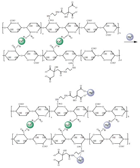 Sodium citrate is a safe, non-toxic, water-soluble, biodegradable, and synthetic organic compound. It is often used as a flavoring agent and stabilizer in the food industry, and as an anticoagulant and a blood transfusion agent in the pharmaceutical industry [16,17]. In addition, sodium citrate is also a good chelating agent and has good complexing ability for metal ions, such as Ca2+ and Mg2+ in water. Alginate is a kind of natural polymer, which is often used in the treatment of heavy metal poisoning and as a drug sustained-release agent [18,19,20,21,22].
